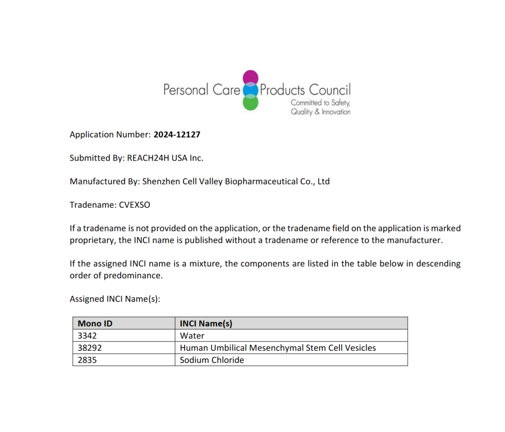 Good news | Shenzhen Cell Valley Exosomes have been certified by INCI, opening a new era of active ingredients in cosmetics